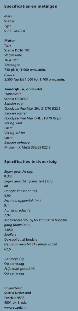 Bergaf gaat het trouwens al net zo goed. De S-serie heeft grotere remschijven gekregen. Dat geeft meer remcapaciteit, waardoor de compressor minder vaak wordt ingezet. En dat scheelt weer brandstof. Toch hoeven we maar zelden met de voet op de rem. De Scania heeft een motorrem èn een vrijloopretarder. Die werken voor het eerst samen, waardoor we zoals het van ons wordt gevraagd netjes met 30 km/h het dorp inrijden en de flitspaal ons met rust laat. Dit alles met de rechtervoet gewoon kalmpjes op de vloer. De Scania S730 is natuurlijk volgestopt met alle mogelijke veiligheidsvoorzieningen. Die werken op zich prima, maar als we voor een chauffeurswissel een afrit oprijden, verslikt de afstandsradar zich en gaan we eventjes fors in de remmen. En dat was nergens voor nodig, dus ondanks al die systemen is zelf opletten wel van belang.