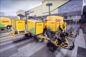DHL heeft woensdag in Utrecht een nieuwe vervoerscombinatie in gebruik genomen voor binnenstedelijke distributie. Het gaat om een slimme trailer in combinatie met de DHL- containerfiets, de Cubicycle. Dit is een fiets op vier wielen met een afneembare container van een kubieke meter met daarin ongeveer 125 kilo aan zendingen. De containers worden voorgeladen in een operationele vestiging van DHL, per trailer naar het stadscentrum vervoerd en daar op de fiets geplaatst. Deze zogenaamde ‘City Hub’ voor cargofietsen kan tot vier containers vervoeren en maakt het mogelijk om grotere pakketten milieuvriendelijk in lastig bereikbare stadscentra te bezorgen en de retourstroom hiervan vanuit de stad te organiseren.