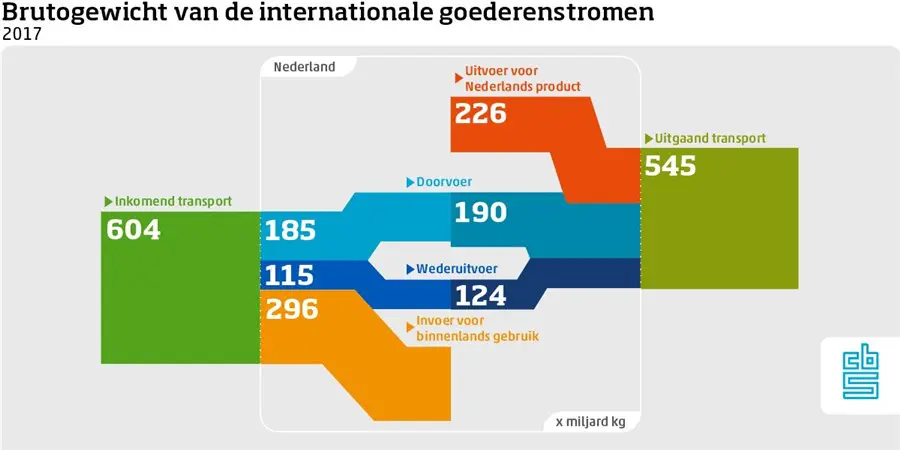 Naast de wederuitvoer en doorvoer ging 226 miljard kilo aan Nederlands product de grens over. In totaal ging 545 miljard kilo aan goederen naar het buitenland, nagenoeg evenveel als in 2016.