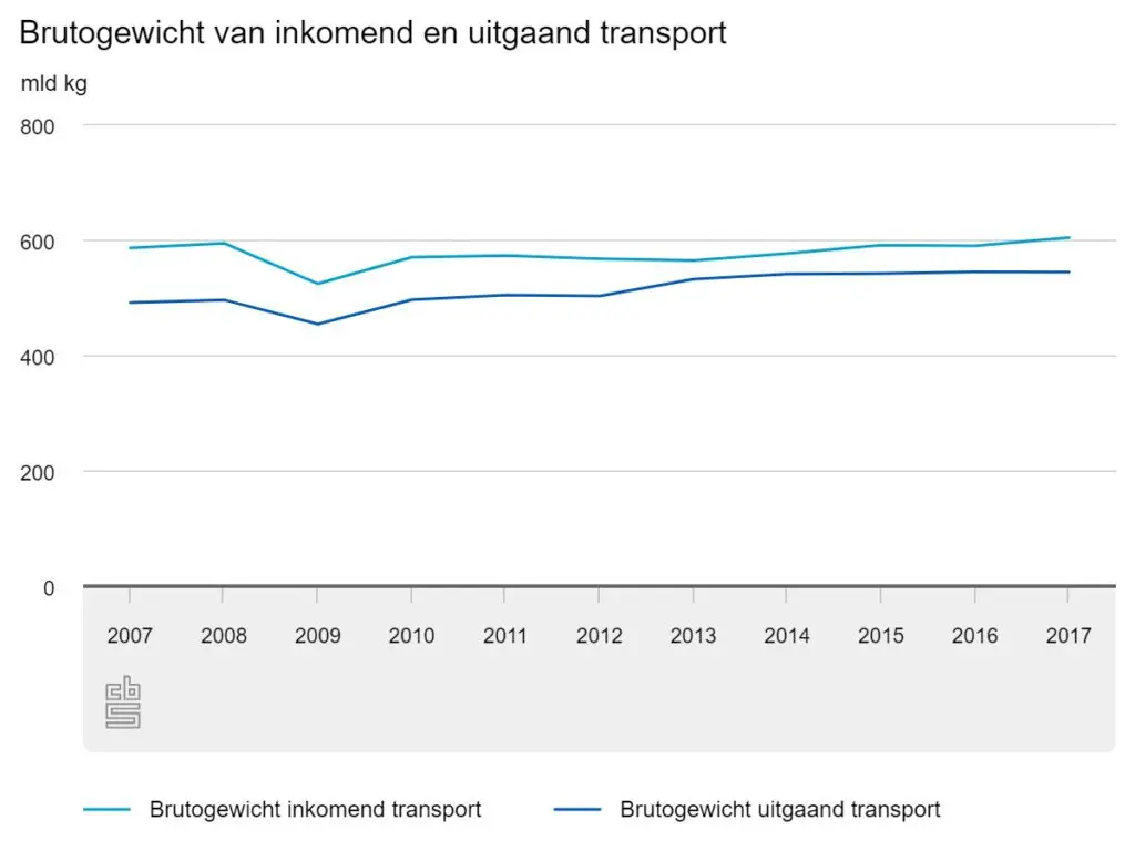 De aanvoer van goederen naar Nederland is in gewicht gemeten met 3 procent gestegen tussen 2007 en 2017. Dat de aanvoer relatief licht gestegen is in deze periode komt mede door de economische crisis. In 2009 daalde de goederenaanvoer in één jaar met 12 procent. Ten opzichte van 2007 werden in 2017 minder ruwe mineralen, ertsen en metalen aangevoerd en meer fossiele brandstoffen. De afvoer van goederen uit Nederland steeg 11 procent in gewicht tussen 2007 en 2017.