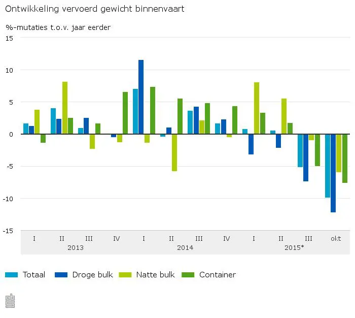 In de maand oktober daalde de hoeveelheid vervoerd gewicht zelfs met 10 procent, naar 29,5 miljoen ton. Wat dat voor gevolgen heeft voor de omzet, is nog niet bekend. De lagere waterstand leidde in oktober tot een toename van het aantal reizen van binnenvaartschepen met 10 procent. Maar per vaarbeweging werd gemiddeld 200 ton minder vervoerd ten opzichte van oktober 2014.