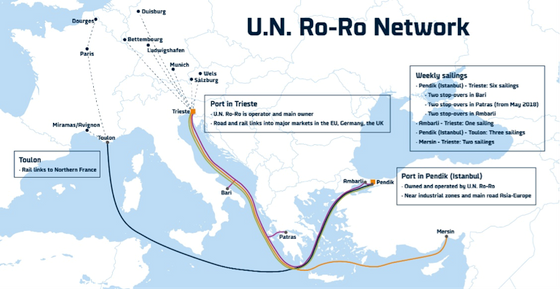 U.N. Ro-Ro exploiteert vijf belangrijke routes tussen Turkije en de EU, door de Turkse havens Pendik, Ambarli en Mersin te verbinden met Trieste en Bari in Italië, Toulon in Frankrijk en Patras in Griekenland. Het bedrijf beheert en bezit een vloot van twaalf grote ro-ro schepen en beheert havens in Pendik, Istanbul en Trieste in Italië. U.N. Ro-Ro biedt ook intermodaal transport tussen de belangrijkste EU-markten en de havens in samenwerking met spoorvervoerders.