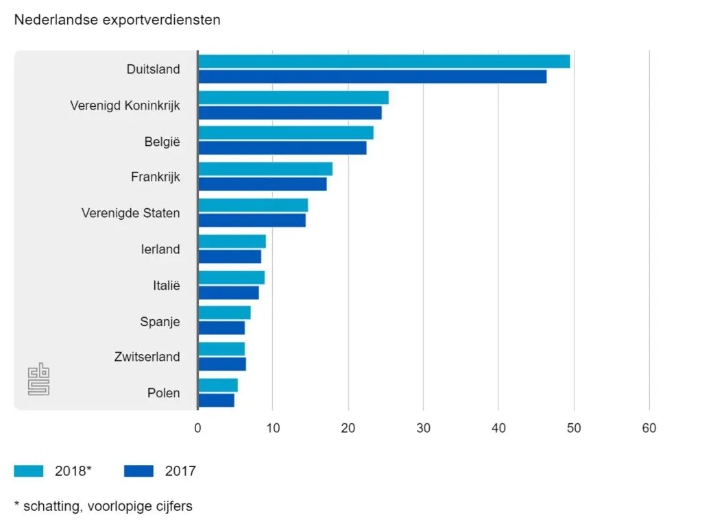 In 2018 verdiende Nederland 49,6 miljard euro aan de export naar Duitsland en daarmee was Duitsland wederom met afstand onze belangrijkste handelspartner. Na Duitsland volgen het Verenigd Koninkrijk en België. Naar België ging een iets groter bruto exportbedrag dan naar het Verenigd Koninkrijk, maar aan de export naar het Verenigd Koninkrijk verdiende Nederland iets meer. In 2018 waren de verdiensten aan negen van de tien belangrijkste exportbestemmingen hoger dan in 2017. Alleen Zwitserland kwam iets lager uit.