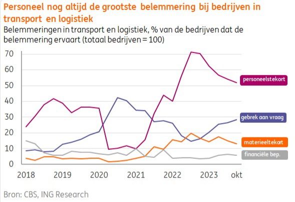 De vraag naar personeel is in de transport en -logistieksector iets teruggevallen, maar blijft in het derde kwartaal nog altijd hoger dan een jaar eerder. Op elke 1.000 banen zijn er nog altijd 46 vacatures. Door de bank genomen blijft beschikbaar personeel voor de meeste bedrijven de grootste beperking, dat is anders dan in eerdere periodes van neergang. Het gaat hierbij niet altijd logistiek personeel zoals chauffeurs en conducteurs, regelmatig ook om technisch personeel, zoals in het onderhoud van materieel. Dit heeft voor een belangrijk deel te maken met vergrijzing en verminderde instroom, maar ook met andere wensen van werknemers. Verder blijft het ziekteverzuim organisaties in transport en logistiek meer dan in andere sectoren onder druk zetten. Zo was het ziekteverzuim in transport en logistiek in het derde kwartaal van 2023 maar liefst 1,4 procent-punt hoger dan in 2019 en bijna een 1 procent-punt hoger dan in de afgelopen 10 jaar. Omgerekend staat dit gelijk aan enkele duizenden werknemers die tijdelijk uitvallen.