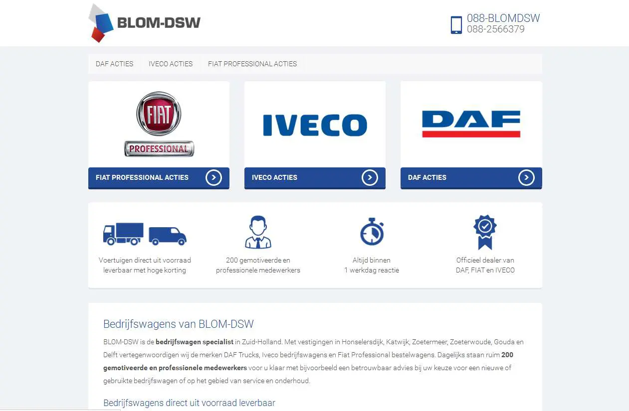 Op de geheel nieuw ontwikkelde website www.blomdswacties.nl kunnen klanten profiteren van alle lopende acties voor nieuwe bedrijfswagens. Ook biedt Blom-DSW scherpe rentes aan op de financiering van een nieuwe bedrijfswagen en is er de mogelijkheid om direct online een scherpe offerte aan te vragen voor een nieuwe Fiat Professional, Iveco of DAF bedrijfswagen.