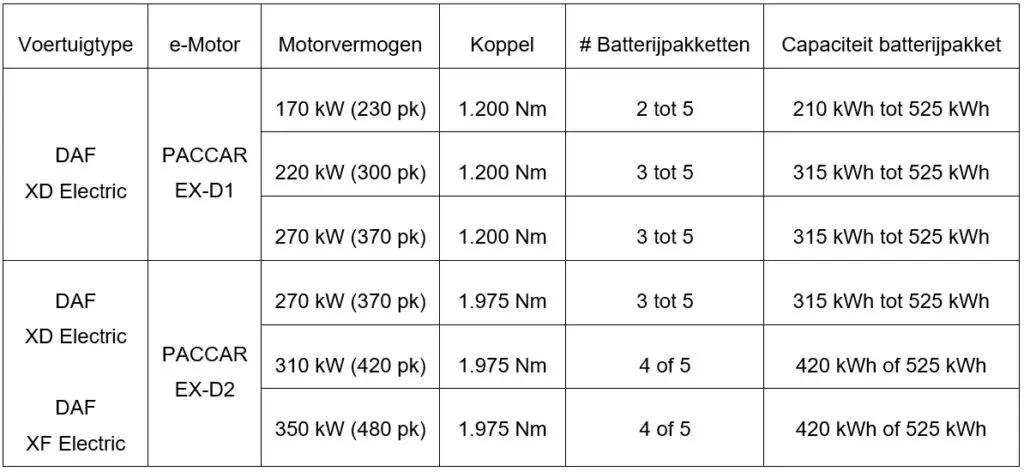 Om de elektrische voertuigen optimaal af te kunnen stemmen op de behoeften en toepassing van de klant, biedt DAF een uitgebreide serie batterijsamenstellingen aan met 2 tot 5 pakketten. Die maken meer dan 500 uitstootvrije kilometers op één acculading mogelijk. Met een optimale voertuig- en oplaadplanning kunnen de XD en XF Electric in de praktijk wel 1.000 volledig elektrische kilometers afleggen.
