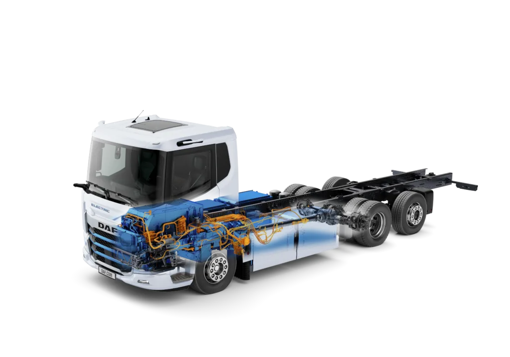 Dat begint al bij de aandrijflijn. Er zijn twee Paccar-motoren voor de XD Electric en de XF Electric. De Paccar EX-D1 is er met vermogens van 170, 210 en 270 kW. De EX-D2 heeft vermogens van 270, 310 en 350 kW. Deze motoren zijn verbonden met een drietrapstransmissie. De elektromotoren zijn direct verbonden met de achteras, die grotendeels eenzelfde opzet en efficiency heeft als de achteras op de XD- en XF-modellen met verbrandingsmotoren. Voor de XB is er de Paccar EX-M1 (120 kW) en de EX-M2 (190 kW). Onder de cabine zit bij de elektrische DAF’s de E-Drive Module, een pakket met accucompressor, cabinecompressor, cabineverwarming, een optionele AC-charger en één accupakket. De XD en XF hebben als maximaal treingewicht 50 ton, de XB 19 ton.