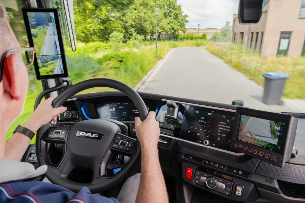 Als laatste rijden we met de XB Electric. Een echte stadsdistributietruck, we rijden de 12 tons versie met 120 kW motor. De aandrijflijn is iets anders, met een eentrapstransmissie en andere accupakketten (in dit geval 220 kWh). Ook de cabine is anders natuurlijk. Hij is niet zo modern en geoptimaliseerd als bij de XD en XF. Er zijn ook geen camera’s leverbaar. Dat is jammer bij een truck die zo veel in de stad rijdt. Wanneer komt die nieuwe XB-cabine DAF? Bij de XB zien we wel een slimmigheidje: regenereren gaat met een knop op het stuur. Hoe slim, want je hoeft je handen niet van het stuur te halen. Dat lijkt ons ook wel een optie bij de XD en XF Electric, waar je de hendel met je rechterhand van het stuur moet bedienen. Iemand weleens gedacht aan flippers achter het stuur, zoals we bij auto’s van Kia en Hyundai zien?