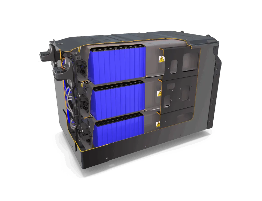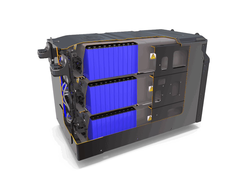 Een accu bestaat bij de elektrische DAF’s drie substacks van 35 kWh. Een accupakket is dus altijd 105 kWh groot en 850 kg zwaar. Bij de XD Electric en de XF Electric zijn er 2 tot 5 accupakketten mogelijk, dus maximaal 525 kWh. De XB Electric heeft diverse opties met een of twee pakketten van 141, 210 of 282 kWh. Alle accu’s van DAF zijn van het LFP-type, en dat betekent dat ze geen kobalt of nikkel bevatten. Een ander voordeel is dat ze tot 100 procent geladen kunnen worden zonder efficiencyverlies.