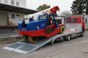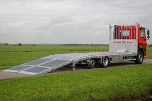 De oprij CF is ook leverbaar als wegenbouwuitvoering. Deze uitvoering heeft handbediende oprijgoten van 2,30 mtr. en een volledig hardhouten vloer. Deze uitvoering kost 10.000 euro minder dan een hoogwerkerversie.