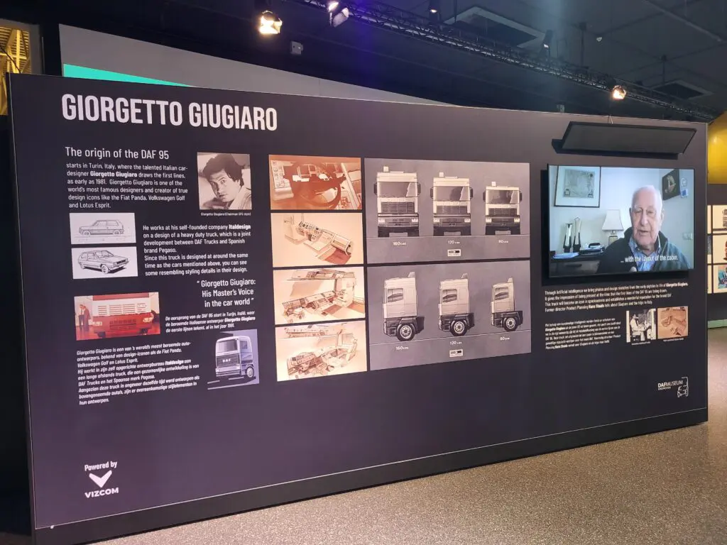 “De tentoonstelling is er eigenlijk omdat we als DAF Design Center in 2024 een archief met tekeningen overhandigden aan het DAF Museum, met de belofte mee te helpen als het Museum er wat mee wilde doen”, vertelt Van Lotringen. “Een gedeelte van dat archief is, met heel veel extra werk erbij, de basis voor deze expositie.” ‘Design met Artificial Intelligence – Verleden & Toekomst’ gaat niet helemaal terug naar het begin van DAF, maar staat nog wel stil bij designer Willem van den Brink, ontwerper van de DAF 600 en ook de vrachtauto’s DAF 2600 en 2800. Echt interessant is hoe uitgelegd wordt hoe Giorgetto Giugiaro, ontwerper van de Fiat Panda en Volkswagen Golf, wordt ingeschakeld bij het ontwerpen van de DAF 95. Met AI zijn onder meer schetsen van Giugiaro verrijkt en tot leven gebracht. Het laat ook zien hoe goed het cabinedesign van de 95 was en dit van 1987 tot nog maar een paar jaar geleden stand kon houden. Het is daarmee echt een legendarisch design.