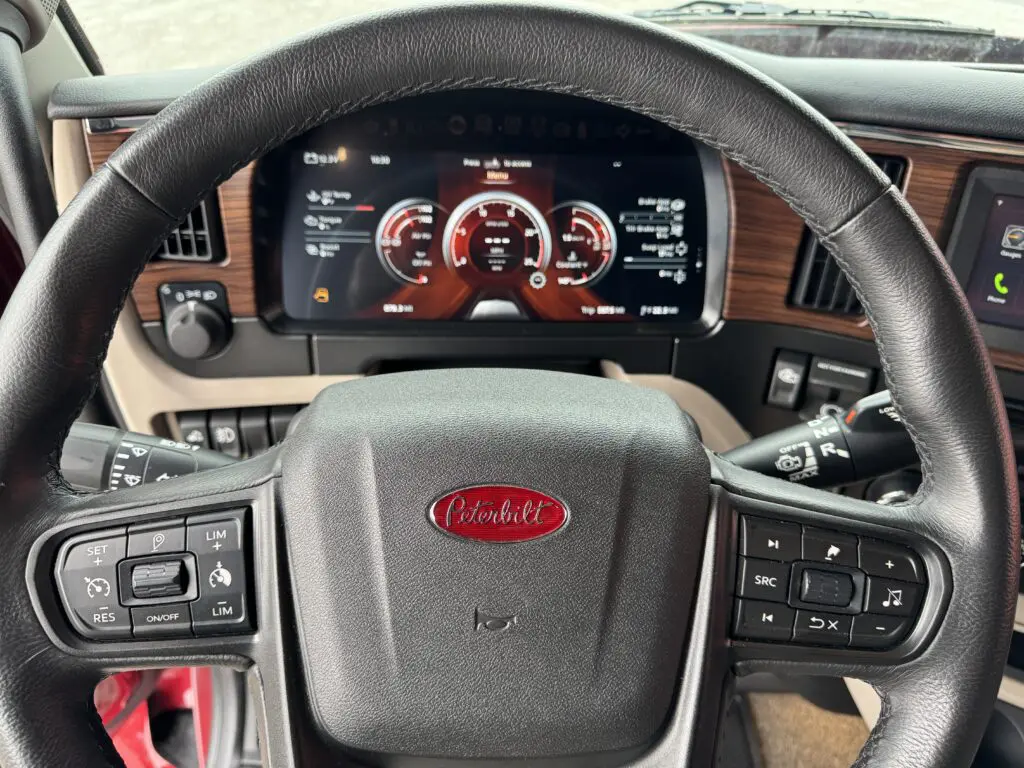 De Peterbilt heeft de MX-13 op 510 pk staan – op papier nauwelijks minder – maar is gekoppeld aan PACCAR’s TX-12. Hier gaat alles wat rustiger: de schakelmomenten zijn trager, het toerental blijft laag, en het geheel ademt die typisch Amerikaanse “take it easy”-stijl. Kickdown is hier niet bedoeld om snel in te halen, maar meer om wat extra drama toe te voegen aan de radioplaylist. En in tegenstelling tot de DAF, mag de MX-13 in de Peterbilt zich hoorbaar laten gelden in de cabine.
