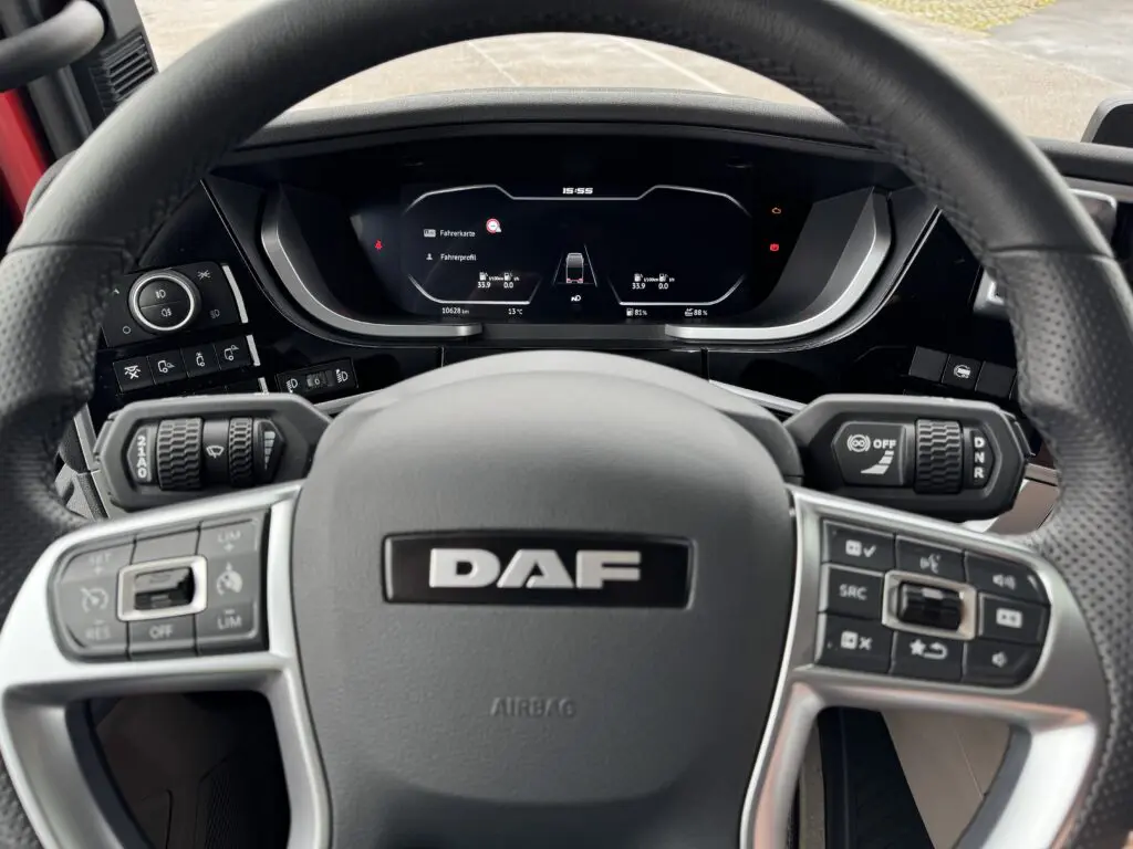 Op de weg voelt de DAF zich duidelijk Europees: strak sturend, precies door bochten en uitstekend in balans op de snelweg. De zichtbaarheid is top, geholpen door cameraspiegels, terwijl de aerodynamica zowel de luchtweerstand als het geluidsniveau flink vermindert.