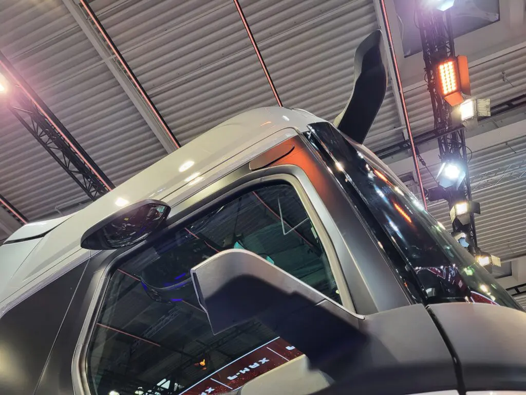 De spiegels zitten op de plek waar normaal de zijbeugels van de spiegels beginnen, onderaan het zijraam. Dat is opvallend, want alle andere merken plaatsen hun camera-armen hoog op de cabine. Alleen Scania plaatste ook ooit de camera’s laag op de cabine, maar stapte daar later vanaf. Op de F-Max op de stand zagen we dus twee zijcamera’s en een camera die de frontzichtspiegel vervangt. De trottoirspiegel zagen we nog wel op de F-Max.