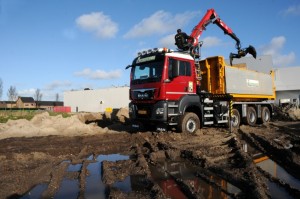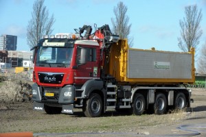 “Wij zochten een allround inzetbare truck met een optimale aslastverdeling en een zo hoog mogelijk laadvermogen”, aldus H. Schoenmaker. Het werd volgens de typeaanduiding een MAN TGS 43.520, maar dat blijkt niet helemaal correct. Dat cijfertje 43 klopt helemaal, want dat is het tonnage, maar het vermogen is een klein beetje bluf. “Een geintje, maar het is wel degelijk een 480 pk uitvoering”, aldus H. Schoenmaker. De nieuwe MAN van Schoenmaker is dankzij het 30 tons afzetsysteem in staat om ook de zwaarste afzetbakken te vervoeren. Verder is er een Penz 172R autolaadkraan gemonteerd. Dat is een kraan met een hoge snelheid en een groot bereik. Hoog op de eisenlijst stond verder een zo hoog mogelijk laadvermogen, maar ook een hoog GVW stond op het verlanglijstje. “Wij hebben als aannemersbedrijf veel eigen machines die we vervoeren op onze eigen dieplader- aanhangwagen. Dat is een vierasser die goed is voor 32 ton, en ook daarmee moet de MAN uit de voeten kunnen. Dat is ook de reden dat we gekozen hebben voor wat meer vermogen. Je moet ook met een geladen auto wel lekker mee kunnen komen, dat vind ik belangrijk. Vandaar de keuze voor de D26 motor met 480 pk”, aldus Hans Schoenmaker.