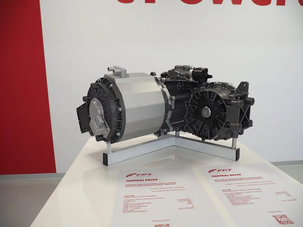 In een ander deel van de nieuwe fabriek wordt de Central Drive, de aandrijving voor de nieuwe generatie eDaily geproduceerd. Hoewel we dat niet te zien kregen, stond er wel een exemplaar ten toon gesteld. Het is een compacte elektrische motor met een piekvermogen van 140 kW die via één vaste tandwieloverbrenging naar de zijkant via een korte aandrijfas het differentieel van de Daily aandrijft. De unit is met een maximum koppel van 1600Nm geschikt voor voertuigen tot 8 ton. Die zijwaartse reductie maakt het ook eenvoudig er een tussenbak aan te bevestigen voor de 4WD-versies. Een ingenieur vertelde TTM.nl dat er ook voor deze constructie is gekozen om bij andere toepassingen een parallel hybride aandrijving mogelijk te maken.
