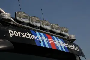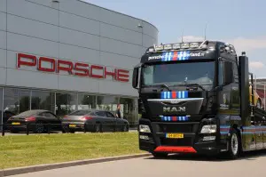 De nieuwe MAN-truck met aanhangwagen staat te glanzen in zijn opvallende zwarte uitmonstering. Door de ‘Martini style’ belijning heeft de combinatie een onmiskenbare Porsche-uitstraling gekregen. De bijzondere kleurencombinatie is typisch Porsche en doet denken aan het legendarische ‘Martini Racing’ team.