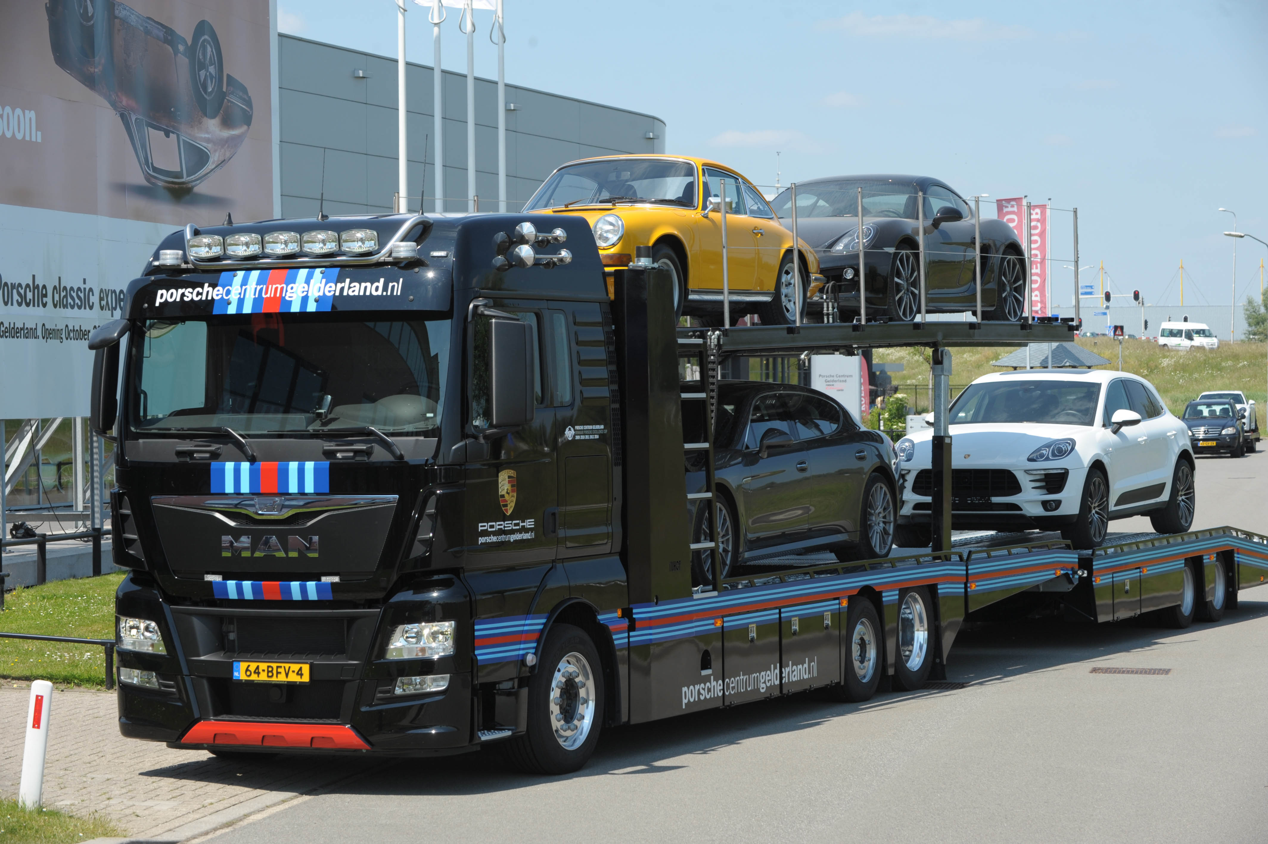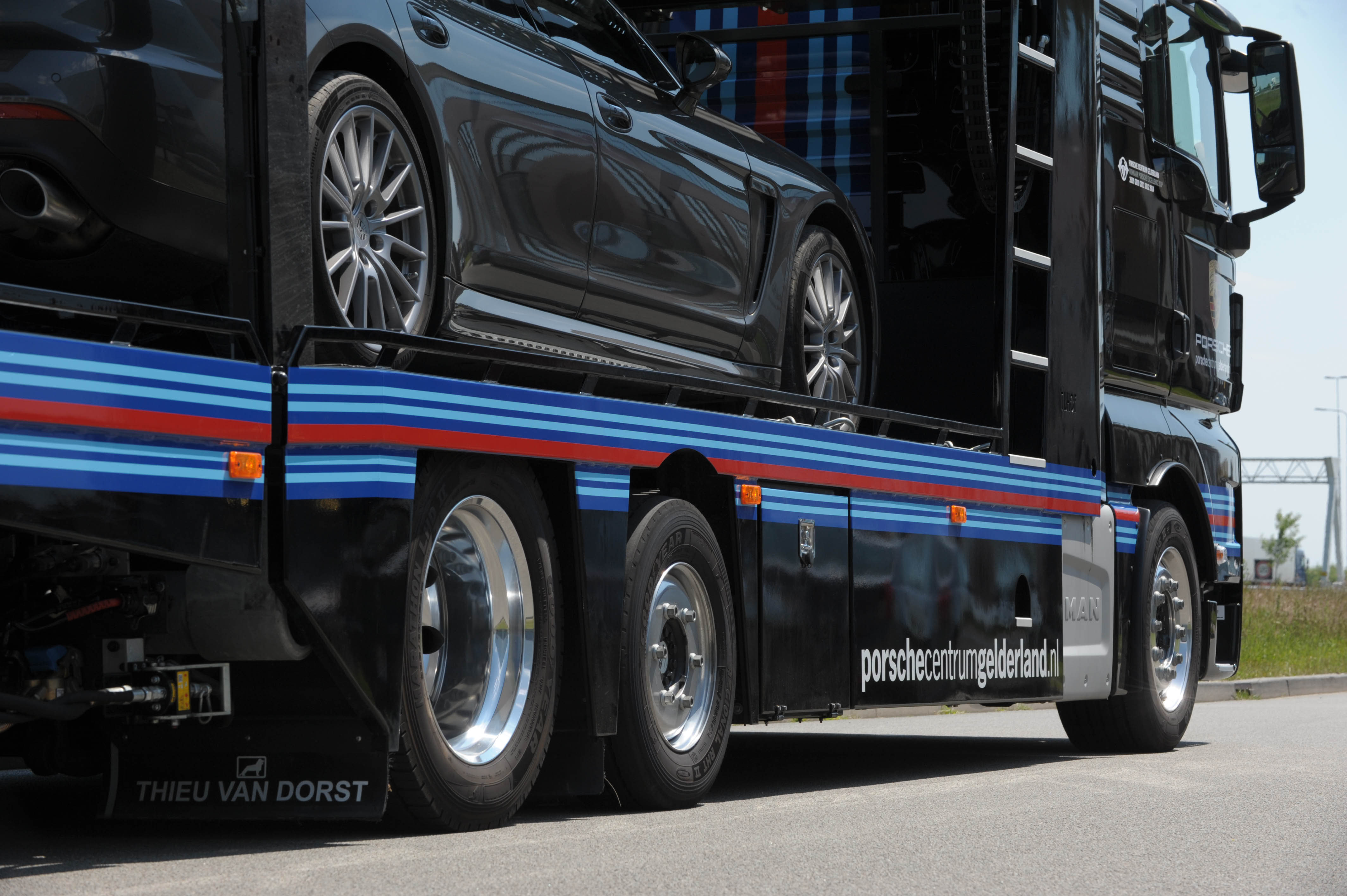 Voor het vervoer van Porsches door heel Nederland, maar ook vanuit Duitsland investeerde Porsche Centrum Gelderland in een opvallende autotransporter. Het werd een MAN 23.400 6×2 met een opbouw die plaats biedt aan maximaal zes Porsches.