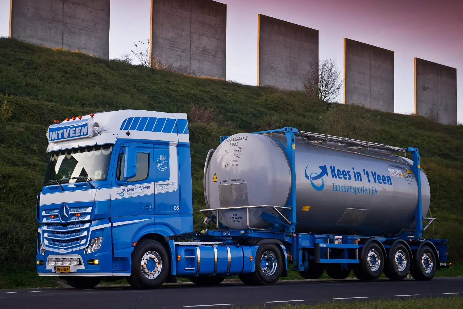 Kees in ’t Veen Tanktransporten uit Europoort is transporteur van tank- en tankcontainertransport van zowel gevaarlijke en ongevaarlijke stoffen zo als levensmiddelen. Het bedrijf is gespecialiseerd in het vervoer van o.a. zuren, logen, waterstofperoxide en gassen. De twee fraaie Mercedes-Benz Actros 1845 LS trekkers met GigaSpace-cabine zijn uitgerust met Predictive Powertrain Control (PPC) waarmee de cruise control van de trucks anticipeert op hoogteverschillen in het traject. De trucks worden ingezet voor het tanktransport van gevaarlijke en ongevaarlijke stoffen. Eén Actros is daarom voorzien van een compressor en de andere van een hydrive die zowel een compressor als een pomp kan aandrijven.
