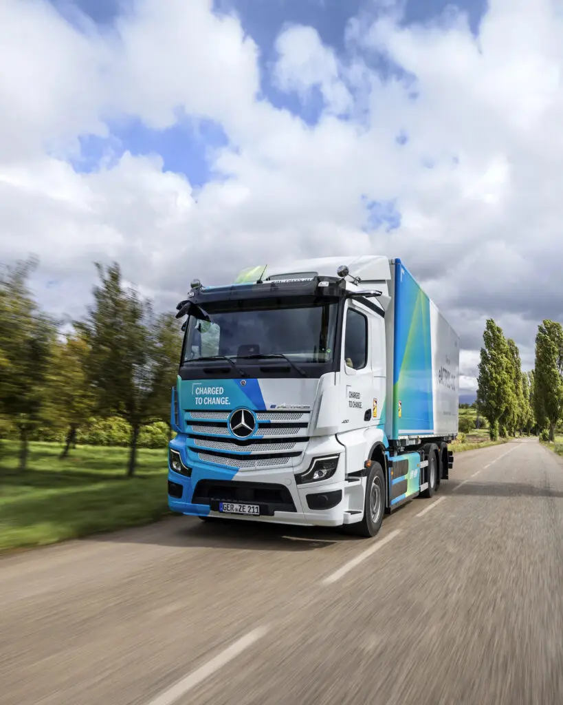 De innovatie gaat overigens ook in Nederland gewoon door. Op onze eigen E-Truck Experience zagen we een eActros 600 met liftbare naloopas, ontwikkeld in samenwerking met Estepe. Met deze as kan meer schoteldruk genereerd worden. Elektrische trucks zijn door hun accupakketten zwaarder dan dieseltrekkers en dat levert bijna altijd problemen op met de belasting op de trekas. Daar mag maximaal 11,5 ton op rusten, net zoveel als met een dieseltrekker. Met een tandemas erbij wordt dat gewicht 16 ton. En dat betekent dat weer meer vervoerders uit de voeten kunnen met een elektrische Mercedes-Benz.