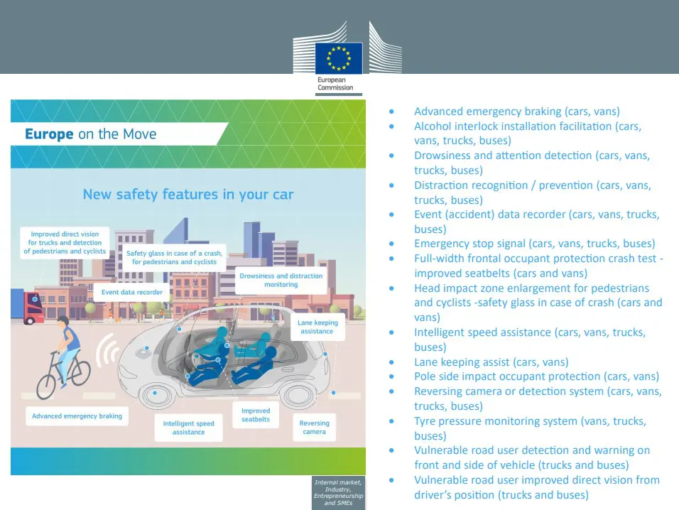 Commissaris Elżbieta Bieńkowska, bevoegd voor Interne markt, Industrie, Ondernemerschap en Midden- en Kleinbedrijf: “Elk jaar komen 25.000 mensen om het leven op onze wegen. De overgrote meerderheid van deze ongevallen wordt veroorzaakt door menselijke fouten. We kunnen en moeten hier verandering in brengen. Met de nieuwe geavanceerde veiligheidsfuncties die verplicht worden, kunnen we dezelfde impact hebben als toen de veiligheidsgordels voor het eerst werden geïntroduceerd. Veel van de nieuwe functies bestaan al, met name in high-end voertuigen. Nu verhogen we het veiligheidsniveau over de hele linie en effenen we de weg voor geconnecteerde en geautomatiseerde mobiliteit van de toekomst.”