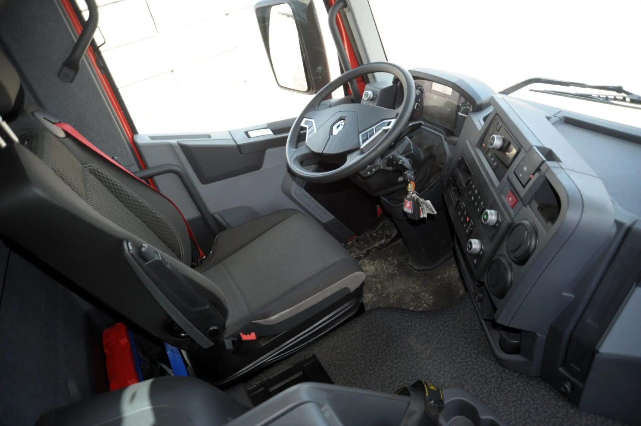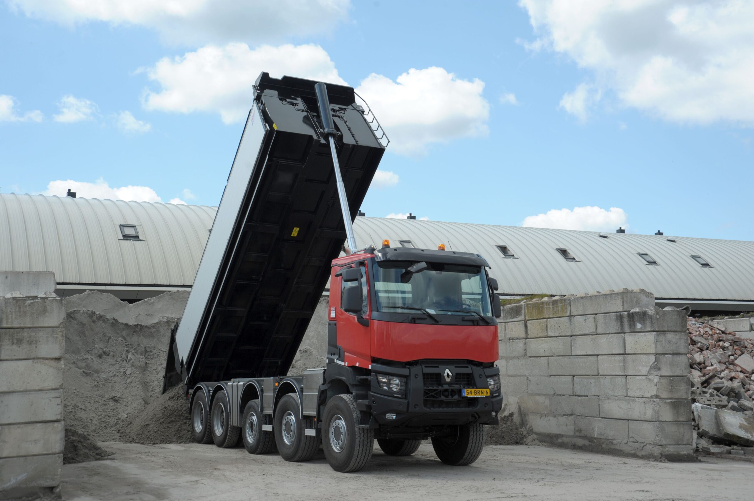 De nieuwe 10×8 ziet er bijzonder robuust uit met zijn stalen bumper met een grote oploophoek, de stoere, ruime cabine en typische bouw accenten zoals de beschermde koplampen. Verder is er een opstap met een handgreep aangebracht achter de linker deur waardoor de chauffeur tijdens het laden in de bak kan kijken. Het interieur van de K is typisch Renault. Dat wil zeggen robuust en functioneel en daarmee bij uitstek geschikt voor het zwaarste werk. De aangepaste OptiDriver Xtrem geautomatiseerde versnellingsbak, zeg maar het Franse neefje van Volvo’s I-Shift, heeft speciale offroad software. Met een extra lage kruipversnelling en zelfs een speciale downhill cruise control voor in het terrein heeft de Renault alles in huis voor het zwaarste werk. Speciale bodemplaten beschermen de kwetsbare delen en het 38 tons tandemstel met naafreductie staat voor een hoge bodemvrijheid en een grote technische reserve.