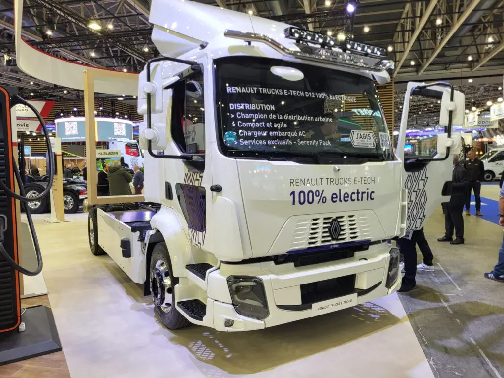 Voor de stedelijke distributie toont Renault Trucks de E-Tech D14, een 14-tonner met compact chassis, korte draaicirkel en volledige luchtvering. Vier LFP-batterijen (176 kWh) zorgen voor een actieradius tot 220 kilometer – voldoende voor een volledige stadsdienst. Laden kan via 43 kW AC of 150 kW DC. De D14 wordt geproduceerd in Blainville-sur-Orne. Op de stand van Renault Trucks (en ook op de foto) staat een D12, omdat die in Frankrijk gevoerd zal worden.