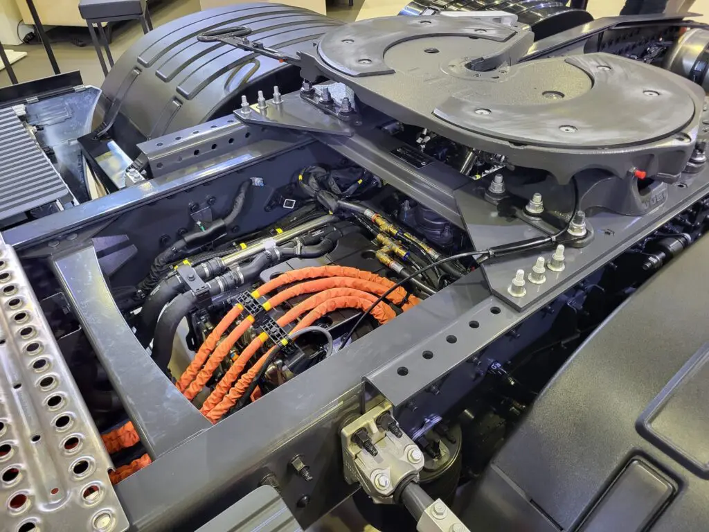 De actieradiuswinst is vooral te danken aan de nieuwe E-axle, waarbij elektromotoren en transmissie in de achteras zijn geïntegreerd. Daardoor ontstaat meer ruimte in het chassis voor extra batterijcapaciteit. De NCA-batterijen (585 of 780 kWh) zijn L-vormig geplaatst en worden gegarandeerd tot 8 jaar of 1 miljoen kilometer. Snelladen kan via MCS tot 720 kW, waarmee circa 350 kilometer bereik in 45 minuten kan worden bijgeladen.