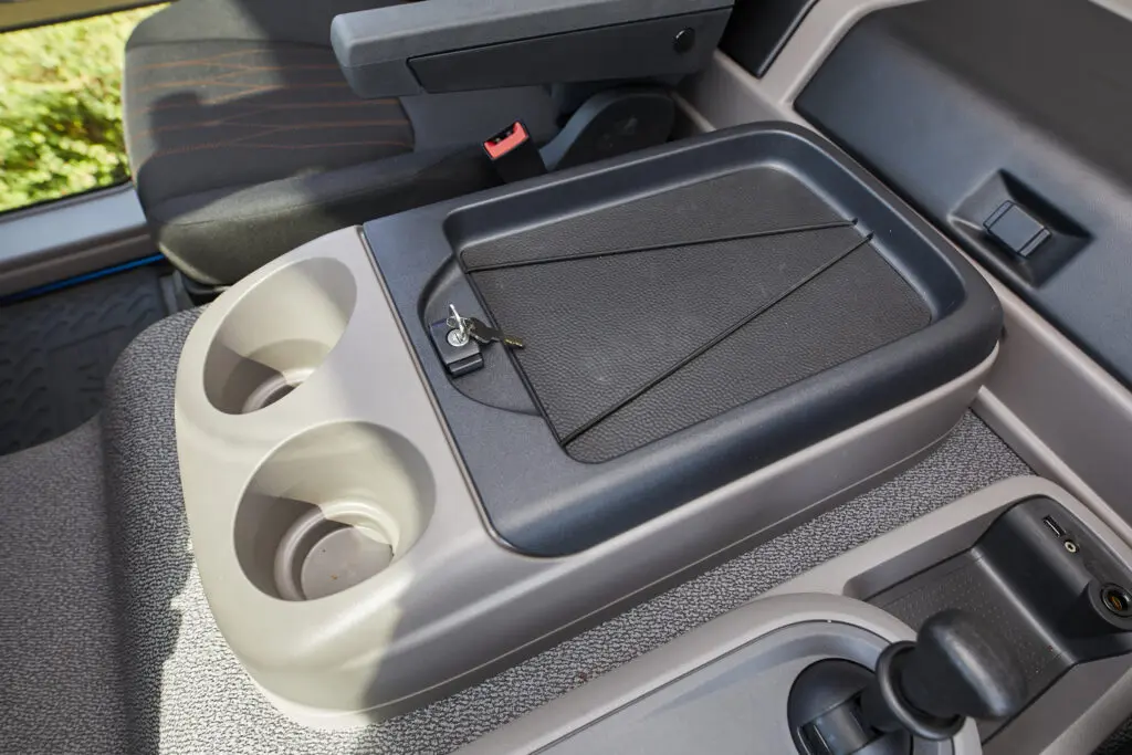 Instappen in de LF gaat eenvoudig. Er is slechts één traptrede, dus we arriveren snel op de 95 centimeter hoog gelegen cabinevloer. De LF heeft letterlijk en figuurlijk een opgeruimde cabine. Hij heeft een ontwerp dat aansluit bij de rest van de DAF’s, met bijvoorbeeld het herkenbare instrumentarium, inclusief DAF Performance Assistent. Op het stuur, helaas niet meer leer bekleed, vinden we tal van functionele knoppen. Standaard aanwezig: Adaptive Cruise Control. Boven de voorruit zien we opbergvakken, en achter de stoelen nog meer. De DAF heeft namelijk een ‘extended day cab’, een verlengde dagcabine. Achter de stoelen zou een smal bed passen, maar bij ons heeft dat plaats gemaakt voor drie grote opbergvakken. Ook de motortunnel is voorzien van een grote opbergbak, plus een documentenhouder en twee bekerhouders. Daarnaast de unit met de bediening van de AS Tronic automaat, plus de mechanische handrem.