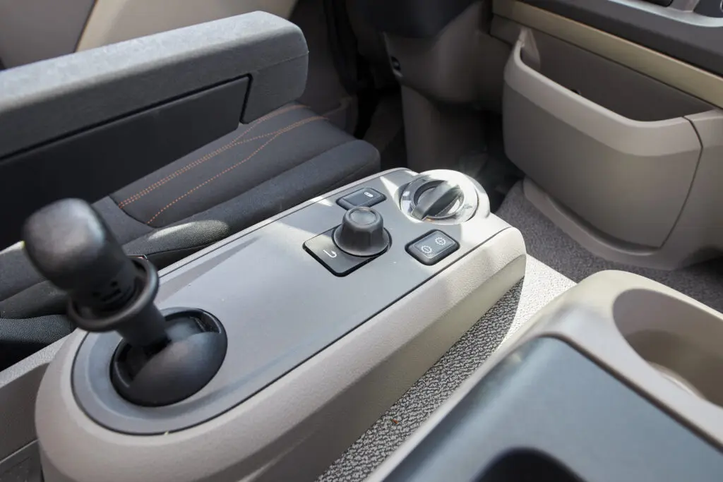 De werkplek van de chauffeur is in orde, al heeft het stuur in deze uitvoering geen lederen bekleding.