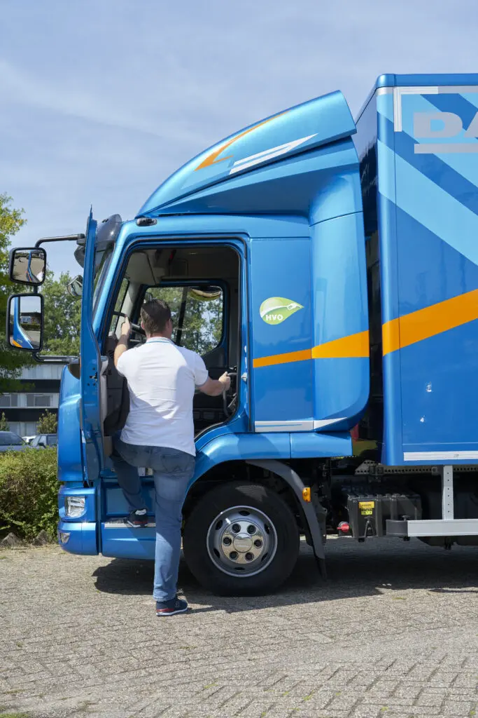 Voordat we instappen in de LF, willen we graag even de motor zien. De LF is dan wel de kleinste truck, hij heeft niet de kleinste motor. Na het kantelen van de cabine zien we de PX-5, een 4,5 liter grote Paccar motor, goed voor 213 pk vermogen en een koppel van 850 Nm, beschikbaar vanaf 1250 toeren. Een nog kleinere variant is de PX-4, van 3,8 liter cilinderinhoud. Cabine weer terug op zijn plek en een laatste blik voor we instappen. Twee dingen vallen op: de wijd uitstaande zijspiegels, die nu een beetje aandoen als olifantsoren, en de grote sticker op de voorzijde die suggereert HVO (hydrated vegetable oil) te tanken, want dat kan 90 procent aan CO2-uitstoot schelen. Fraaie suggestie, heel groen ook, maar bij de BP in Deventer kun je helemaal geen HVO tanken. En dat is bij de meeste tankstations in Nederland zo…
