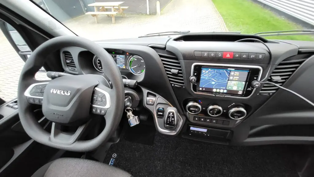 De eDaily ziet er weer potent uit, zeker met zijn dakspoiler voor extra aerodynamica. De 16 inch velgen zijn fraai. Alleen het plaatje met ’38 ELEC’ verraadt dat we hier met een zware auto te maken hebben. Deze Iveco komt als bestelauto het dichtst bij de vrachtauto. Tenminste, dat deed hij als Daily met verbrandingsmotor. Hoe zit dat met de elektrische versie? Eerst gaan we maar eens in het interieur kijken. We komen makkelijk de cabine in, waar ons veel bekends wacht. De prima zittende stoelen bijvoorbeeld, inclusief in hoek verstelbare zitting. We zien in het display nog analoge klokken maar ook digitale info. Dat komt voor een deel overeen met het touchscreen in het dashboard. Dat geeft veel info over de auto en correspondeert met de Iveco ON app op de smartphone. De aanwezige tachograaf hoeven we niet te gebruiken, het afgeplatte stuur ligt fijn in de hand. Altijd goed in de Daily: de volop aanwezige bergruimte.