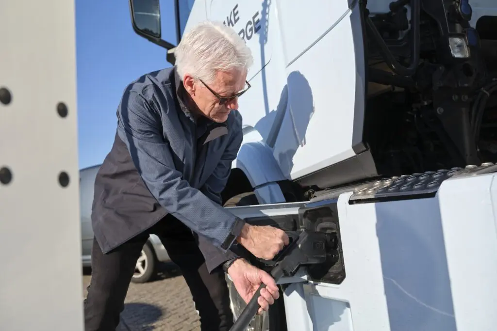 De koffie is op, het daglicht laat zich een beetje zien en als we bij de laadpaal aan komen staat het display op zowel laadpaal als truck toch echt op 100 procent. Kortom, we zijn klaar voor vertrek. Eerst wel nog even de trailer aankoppelen, want de hele combinatie past niet bij de laadpaal van ElaadNL. Verbeterpuntje voor de engineers…