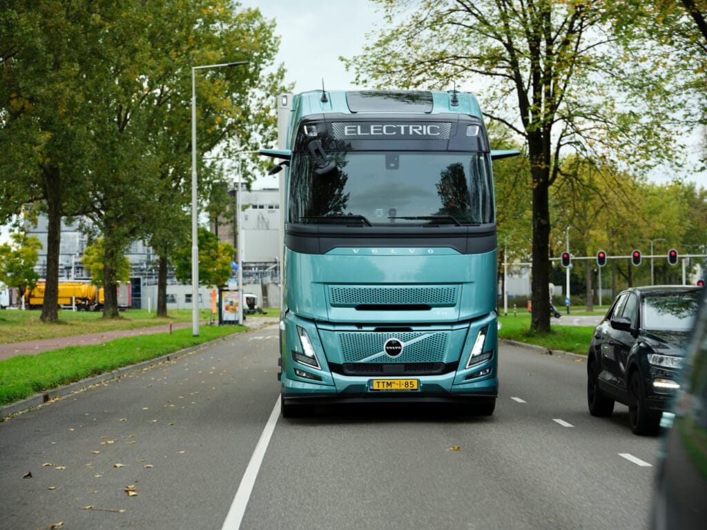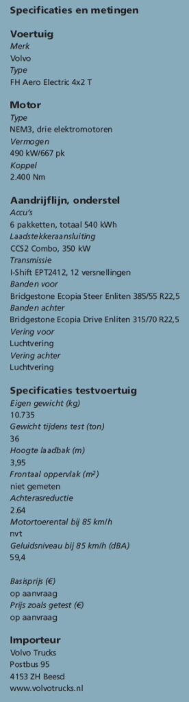 Na ruim 48 kilometer over binnenwegen zetten we de Volvo stil in Barneveld. Tijd voor koffie en een tussenstand. We hebben 86,0 kWh aan energie verbruikt en 17 procent van het accupakket verbruikt. Benieuwd wat de rest van de test ons gaat brengen, want die is nog 160 km lang. Veel daarvan is snelweg, we rijden van Amersfoort naar Zwolle, Apeldoorn en Deventer en binnendoor over Zutphen weer naar Arnhem. Onderweg kunnen we genieten van de rust die de elektrische aandrijflijn brengt. Daarbij is er comfort dankzij de luchtvering rondom van het chassis. De 667 pk van de drie elektromotoren hoeven niet allemaal aangesproken te worden op het platte Nederlandse parcours. Het totaalgewicht van de combinatie is 36 ton. Onderweg zien we chauffeur Sean regenereren met de motorrem. Zo vloeien er heel wat kilowatturen terug de accu’s in.