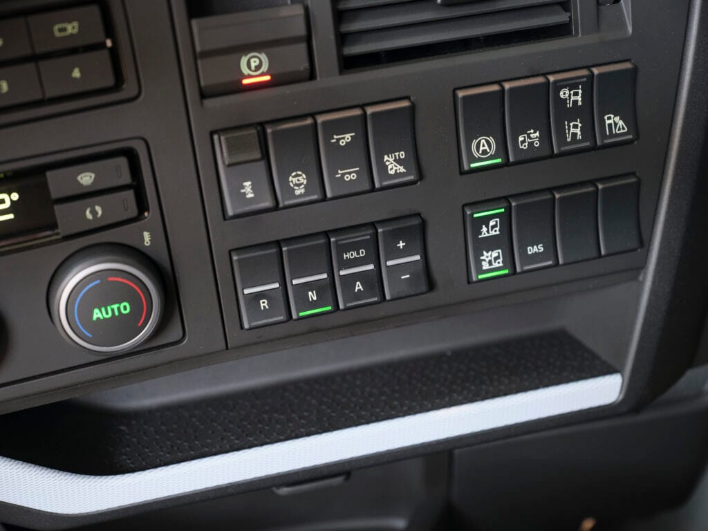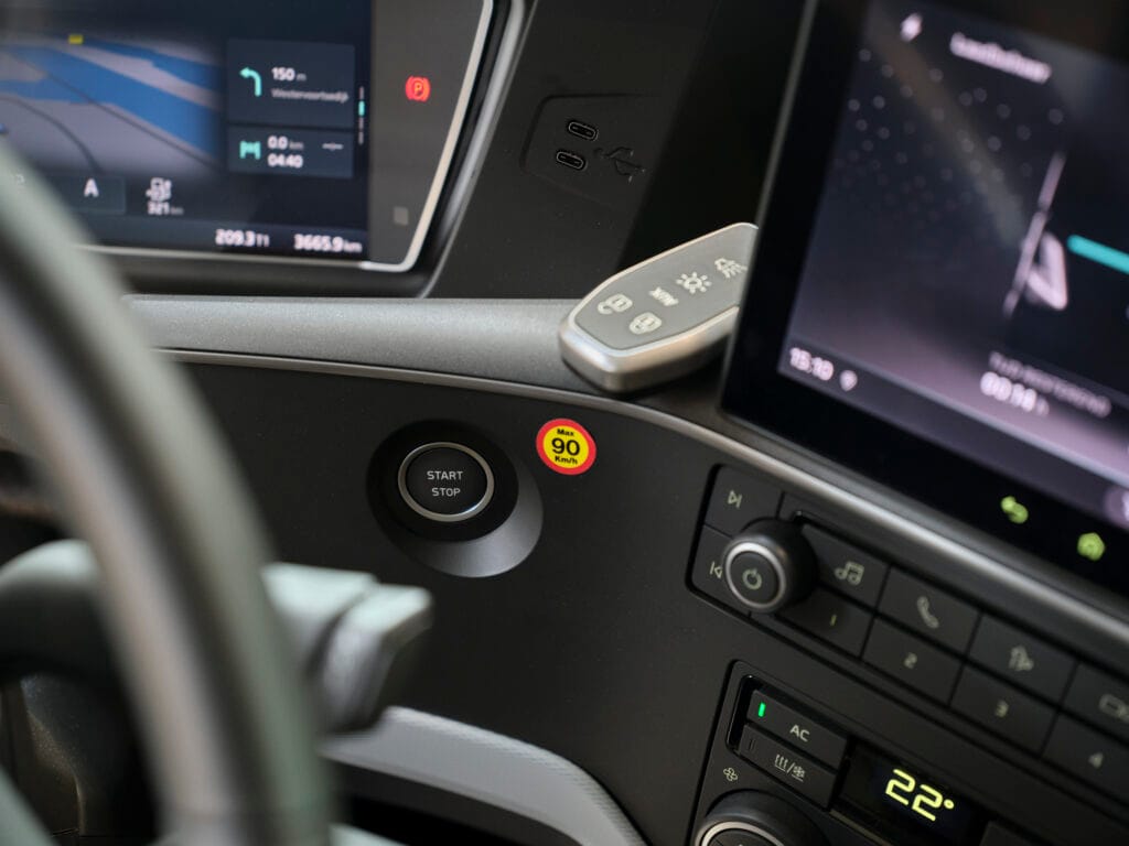 De FH Electric kennen we al goed. Fraai is natuurlijk de Aero-uitvoering, met ronde vormen en de 24 cm langere neus. Boven de voorruit en het dak van de High Sleeper Cab van de FH staat levensgroot ‘Electric’, dus iedereen kan zien dat we emissievrij onderweg zijn. Het Camera Monitoring System levert twee camera’s aan de zijkanten van de cabine op. We zien ook nog een frontzicht en een trottoirspiegel, maar weten dat we die optioneel kunnen laten vervangen door een CornerEye camera. Onderweg mijmeren we wel een beetje over de volgende versie van de FH Electric. Die heeft een elektrische as en een actieradius van 600 km. Dan kunnen we wel internationaal gaan testen…