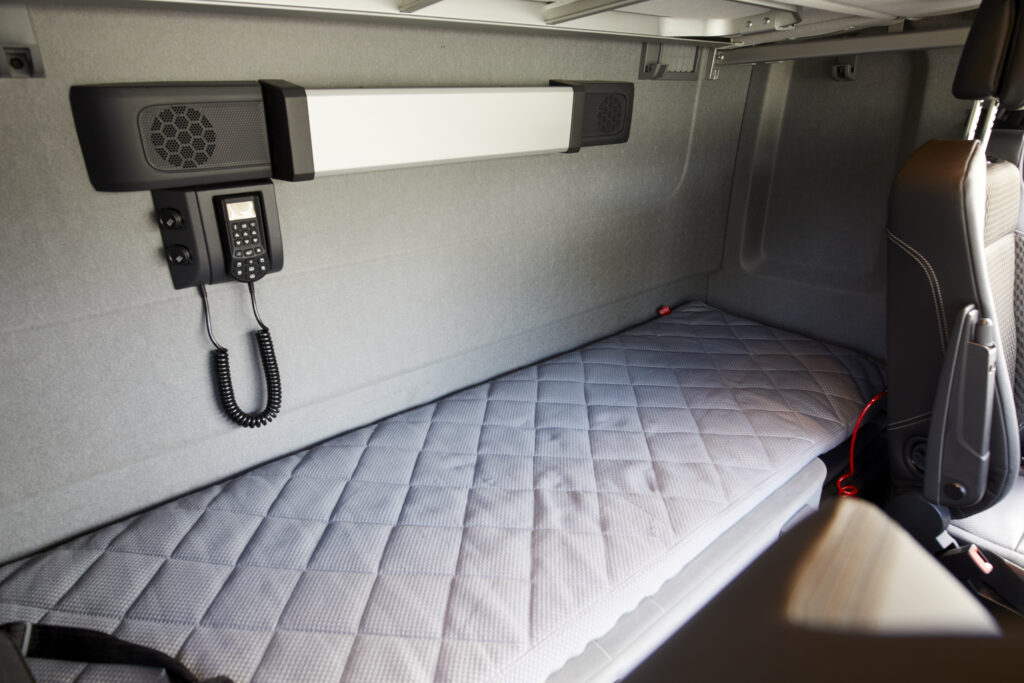 Tijdens de rit is er genoeg tijd om rond te kijken in de cabine die is uitgerust met het Comfort-pakket. De verstelbare zwartleren Recaro bestuurdersstoel heeft stoelverwarming en -ventilatie en heeft, net als de bijrijdersplek, armsteunen en is luchtgeveerd. De stoel kan 20 centimeter naar achteren voor meer beenruimte. Het bed is uittrekbaar zodat een breder matras ontstaat en het opklapbare bovenbed kan fungeren als extra opbergruimte. Er zijn meerdere 12V-aansluitingen aanwezig en om het af te maken is deze demotruck uitgerust met een standairco en standkachel.