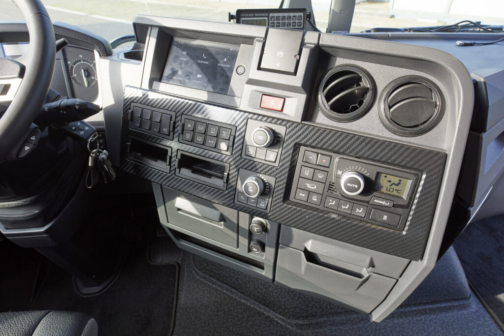 Diverse onderdelen in de cabine hebben een carbon-afwerking. Het instrumentenpaneel is duidelijk op de bestuurder gericht; alle knoppen zijn binnen handbereik en desgewenst anders in te delen. Ook kunnen veel functies via het multifunctionele stuur worden bediend. Handig: je kan naar eigen voorkeur instellen wat het dashboarddisplay laat zien. Dat wordt vervolgens opgeslagen op je bestuurderskaart en elke volgende Renault Truck waar je instapt, herkent jouw instellingen.