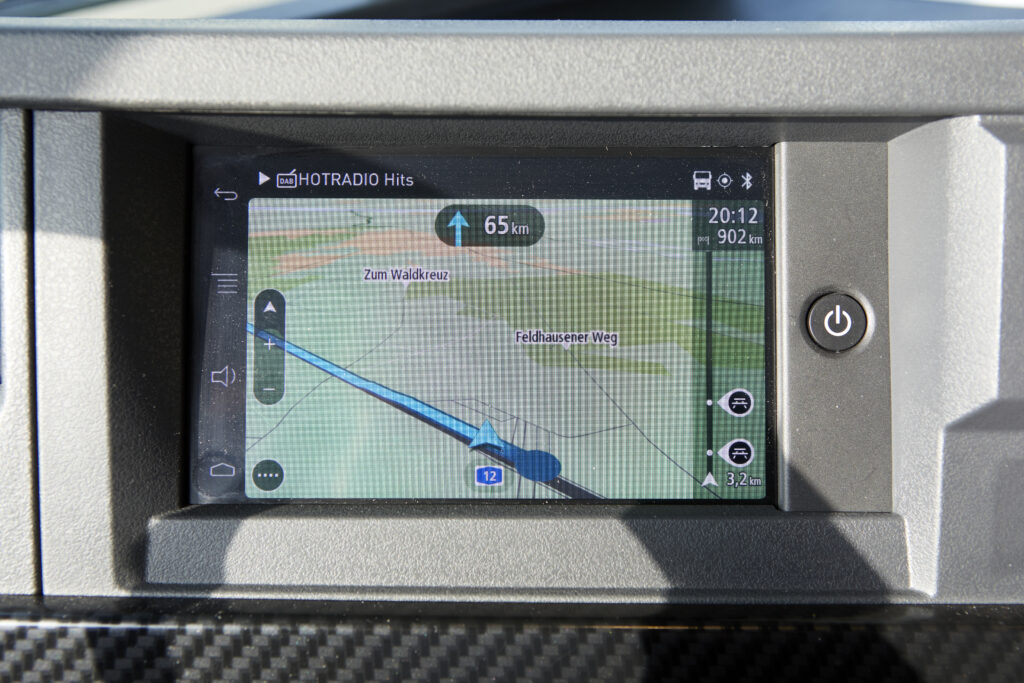 Onbedoeld rijden we iets over de wegmarkering heen en meteen klinkt er een geluidssignaal ter waarschuwing. En zo zijn er meer rijhulpsystemen aanwezig. Natuurlijk AEBS, dat een waarschuwing geeft bij een naderende botsing en de truck kan afremmen tot totale stilstand als de chauffeur niet ingrijpt, ESC voor meer controle over het voertuig als kantelen dreigt, Hill Start Aid dat ondersteunt bij het wegrijden op hellingen en een continue monitoring van de bandenspanning met TPMS.