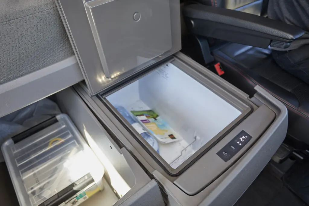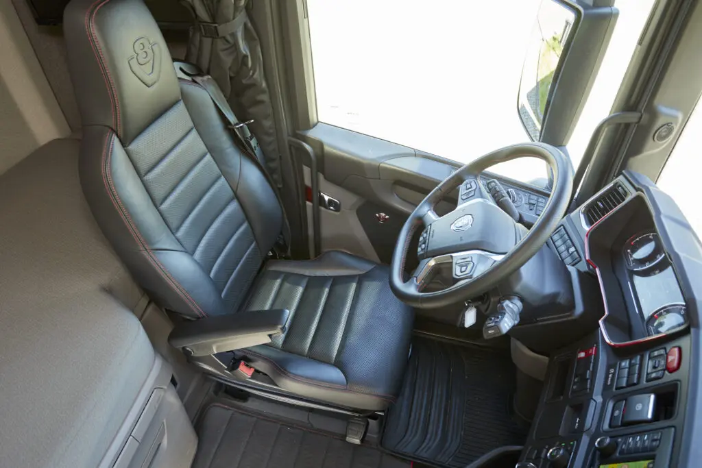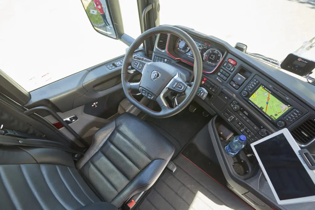 Aan comfort geen gebrek in deze Scania. Zoals gezegd is er een vlakke vloer, dus kunnen we ons prima bewegen en je moet wel hééél lang zijn wil je in deze S-cabine niet recht op kunnen staan. Boven de voorruit en tegen de achterkant is er een massa opbergruimte, onder het bed is er natuurlijk een ruim bemeten koelkast. De stoelen zijn met zwart leer bekleed en in de hoofdsteun vinden we het V8-symbool terug. De V8 horen we ook als we de sleutel omdraaien. Tijd om op weg te gaan. Het valt al snel op hoe stil het blijft in de cabine. Je zou verwachten dat een V8-motor het geluid afgeeft dat je verwacht (van vroeger en zo), maar de geluidsmeter komt in ons geval niet verder van 67 db(A), wat echt heel stil is. Op de camerabeelden voor het vlog bij deze test horen we de motor méér dan in het echt. Heeft misschien iets te maken de frequentie van het geluid, maar het kan natuurlijk ook dat Scania dat bewust doet, om het menselijk oor te ontlasten. De 650 pk versie van de 16,4 liter grote DC16 is een bijzondere motor, want hij heeft het hoogste vermogen van Scania’s SCR-only motoren. De 730 pk-versie van de V8 heeft als enige EGR.