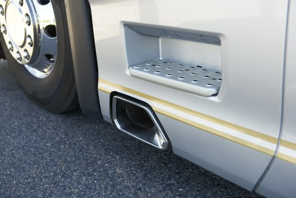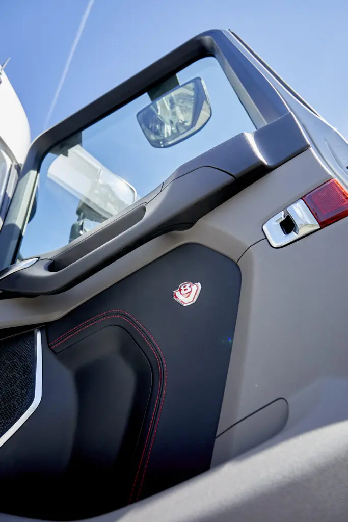 Scania wilde zelf het 50-jarig jubileum ook niet ongemerkt voorbij laten gaan en dus is er een heus jubileummodel opgetuigd. Dat staat dan ook bij de Nederlands-Duitse grens aan de A12, het beginpunt van onze internationale testroute. Het is een bijzonder fraaie truck, een Scana S-series, dus met de hoge cabine en de vlakke vloer. Alleen… onze testtruck is gespoten in ‘Silver Arctic’ grijs, terwijl de Nederlandse actiemodellen er zijn in het zwart en rood. Aan de buitenzijde is met speciale stickers en striping duidelijk gemaakt dat het om een jubileummodel. Fraaidetail zijn de ‘V8’ naafdoppen in de wielen. En natuurlijk heeft deze Scania V8 de glimmende V8 grille. Achter onze testtruck staat een gestroomlijne Krone oplegger, gespoten in bijpassende kleuren. Op het dak van deze Scania zit een dakspoiler die elektrisch verstelbaar, met een knop in de cabine. Wat een luxe!