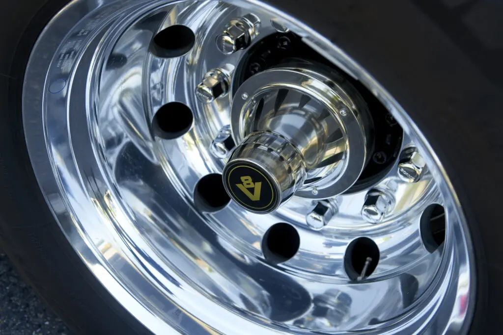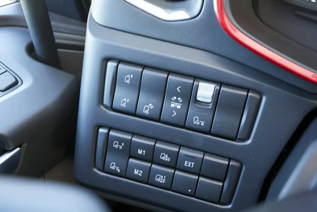Een trucktest op de internationale testroute van TTM.nl beginnen we altijd vroeg, om zo veel mogelijk files te vermijden. Het is 6.00 uur ’s morgens als we starten maar toch is het al helemaal licht. Het is namelijk volop lente en de langste dag, Midsommar op zijn Zweeds, is aanstaande. Dat is in Zweden een echte feestdag dus er zou zomaar een feestmaal in de cabine kunnen staan. Snel klimmen we de cabine. Hoewel, snel…, we moeten vijf treden langs voor we de op 160 cm hoogte geleden cabinevloer kunnen betreden. Daar wacht ons (helaas) geen feestmaal, maar wel een fraai ingerichte cabine. Nog fraaier dan normaal, want de 50 Year Edition uitvoering heeft onder meer exclusieve goudkleurige 50 jaar V8 deurpanelen, zwart lederen stoelen met rode stiksels en V8 logo en een V8 lederen stuur met rode stiksels. Als het nog donker was geweest hadden we de fraaie V8 LED-verlichting uit de deuren op de grond kunnen zien schijnen bij het instappen.